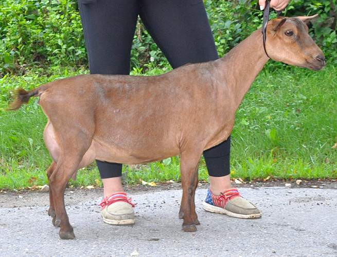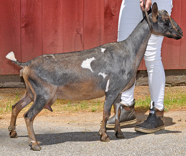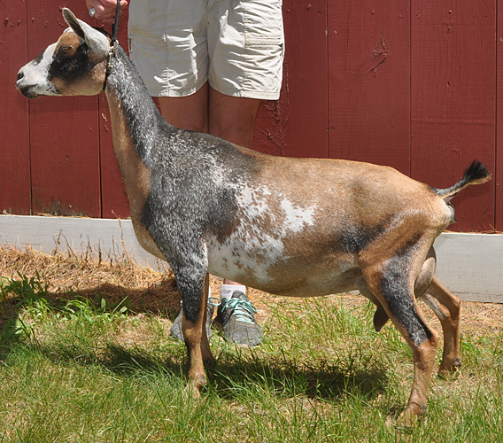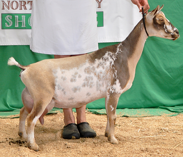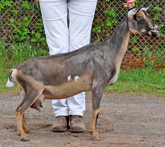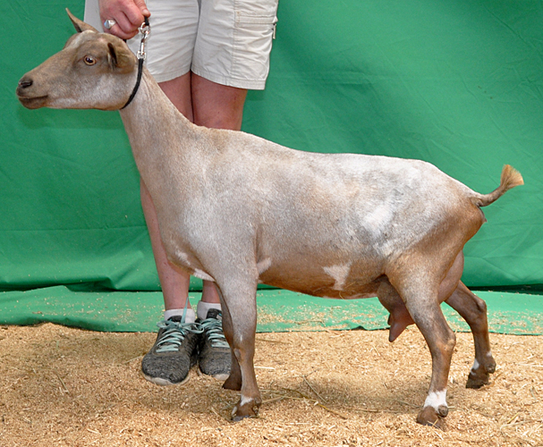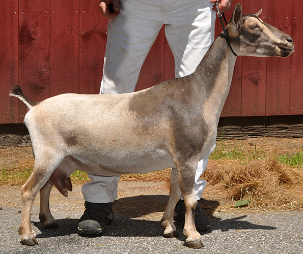 Another gangly 2 year old, but I like her. Our youngest Xanthippe daughter is just as pleasing to me as her older sister Nimbus. Her show photos (cold rainy weather) don't really reflect the quality of her udder the way her early milk stand photos do. Another Sundog daughter with lots of potential here.