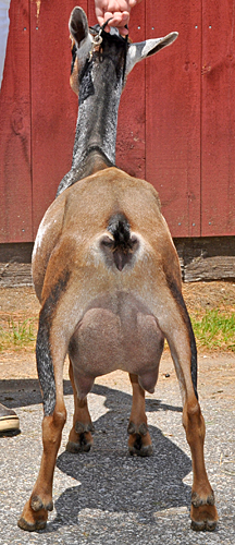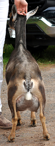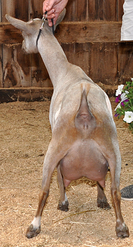 When we lost Jamboree prematurely last year I was very glad I had retained this daughter. Like many of our young does, at 2 years she is still gangly and lean, but she is quite wide where it counts at this point: thurl to thurl.