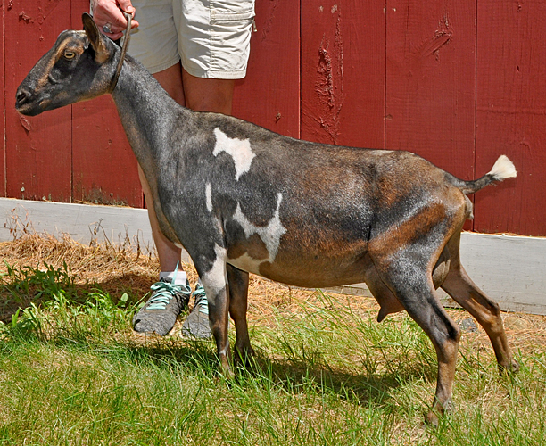 Another gangly 2 year old, but I like her. Our youngest Xanthippe daughter is just as pleasing to me as her older sister Nimbus. Her show photos (cold rainy weather) don't really reflect the quality of her udder the way her early milk stand photos do. Another Sundog daughter with lots of potential here.